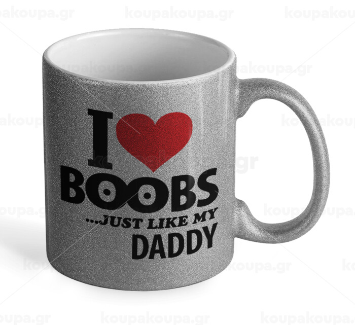 I Love boobs ...just like my daddy, Κούπα Ασημένια Glitter που γυαλίζει, κεραμική, 330ml