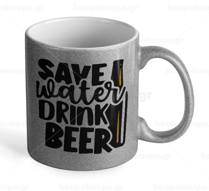 Save Water, Drink BEER, Κούπα Ασημένια Glitter που γυαλίζει, κεραμική, 330ml