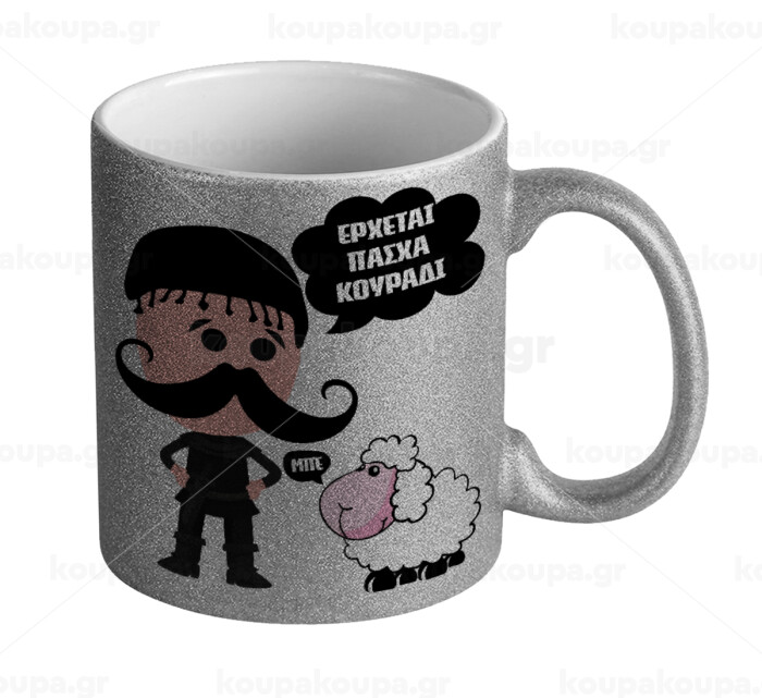 Κρητικός "Έρχεται Πάσχα κουράδι", Κούπα Ασημένια Glitter που γυαλίζει, κεραμική, 330ml