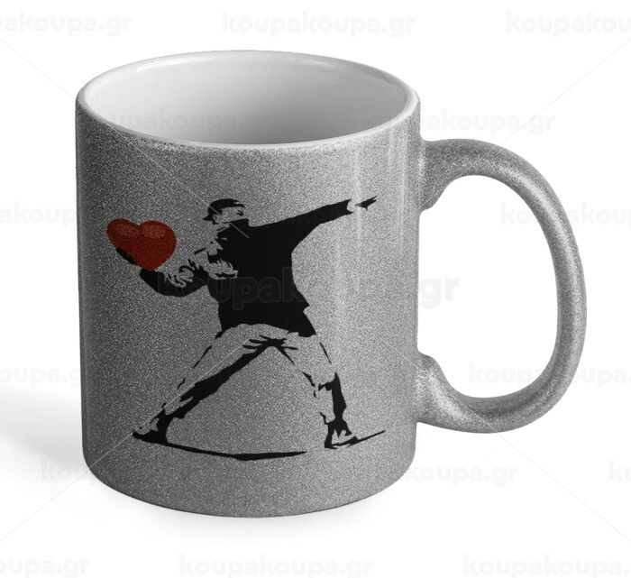 Banksy (The heart thrower), Κούπα Ασημένια Glitter που γυαλίζει, κεραμική, 330ml