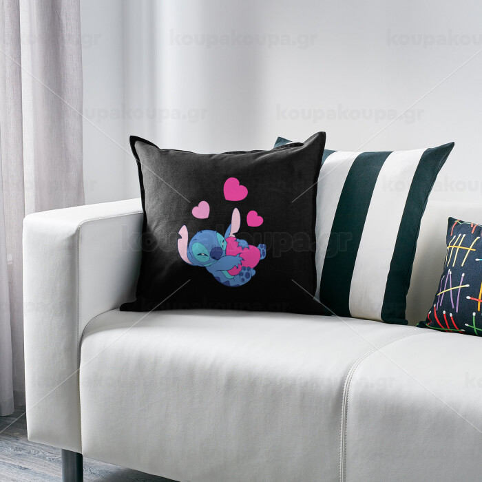 Lilo & Stitch hugs and hearts, Μαξιλάρι καναπέ Μαύρο 100% βαμβάκι, περιέχεται το γέμισμα (50x50cm)