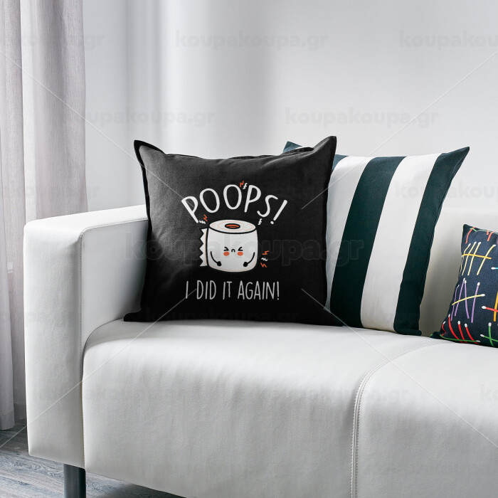 Poops!...I Did It Again, Μαξιλάρι καναπέ Μαύρο 100% βαμβάκι, περιέχεται το γέμισμα (50x50cm)