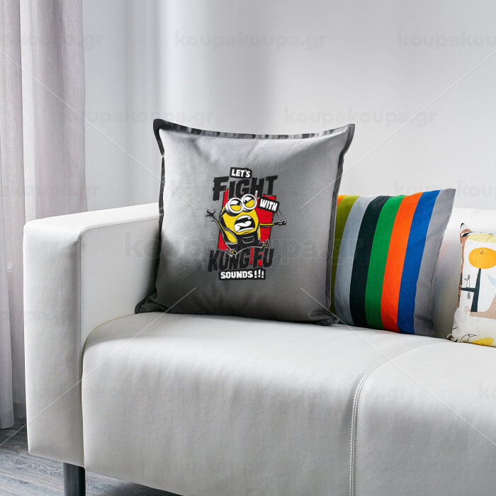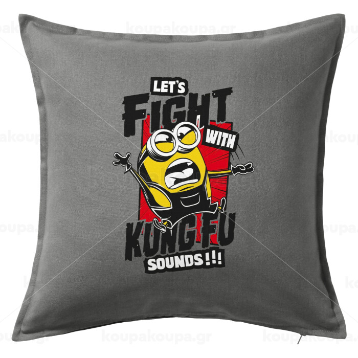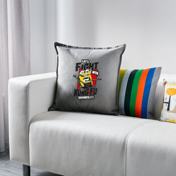 Minions Let's fight with kung fu sounds, Μαξιλάρι καναπέ Γκρι 100% βαμβάκι, περιέχεται το γέμισμα (50x50cm)