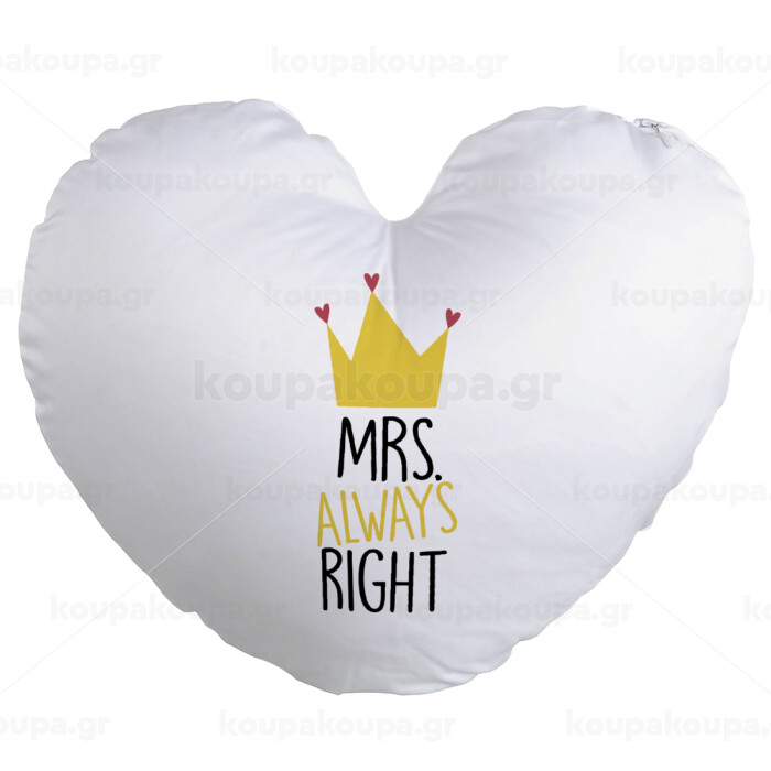 Mrs "Always" right, Μαξιλάρι καναπέ καρδιά 40x40cm περιέχεται το γέμισμα