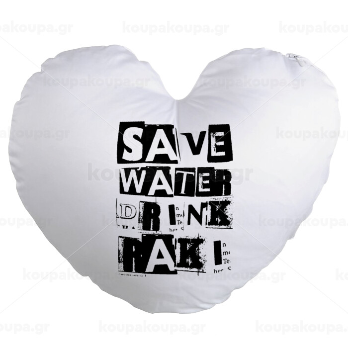 Save Water, Drink RAKI, Μαξιλάρι καναπέ καρδιά 40x40cm περιέχεται το γέμισμα