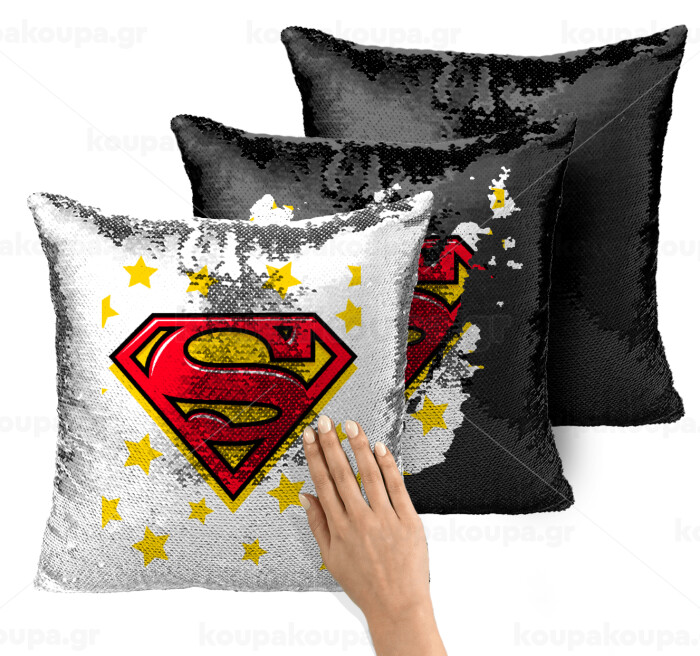 Superman Blue, Μαξιλάρι καναπέ Μαγικό Μαύρο με πούλιες 40x40cm περιέχεται το γέμισμα