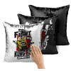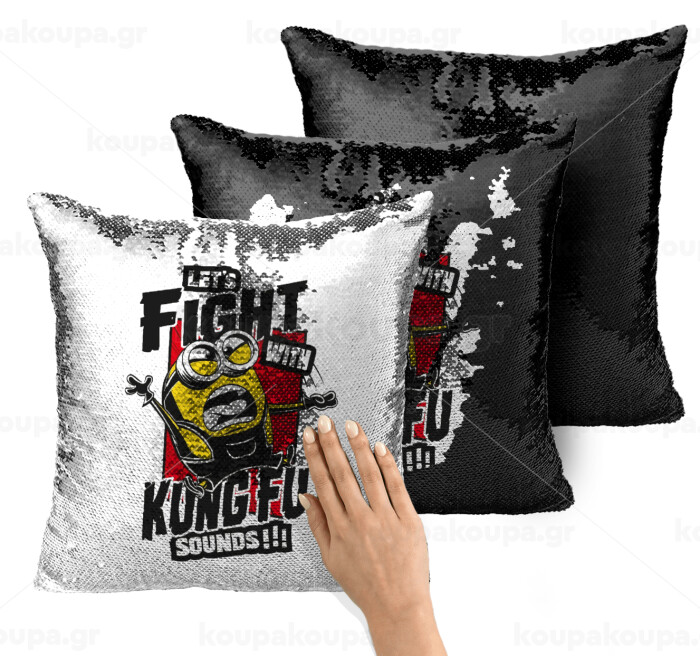 Minions Let's fight with kung fu sounds, Μαξιλάρι καναπέ Μαγικό Μαύρο με πούλιες 40x40cm περιέχεται το γέμισμα