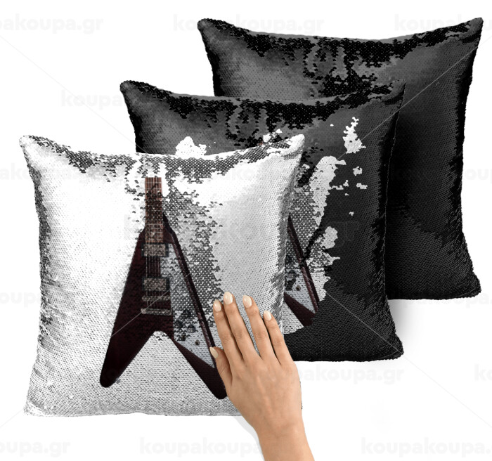 Guitar flying V, Μαξιλάρι καναπέ Μαγικό Μαύρο με πούλιες 40x40cm περιέχεται το γέμισμα