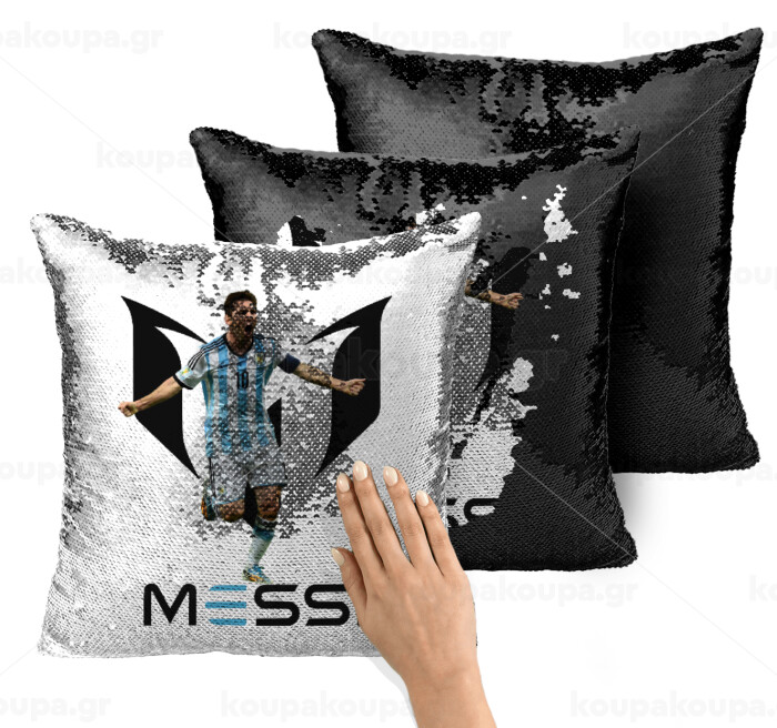 Λιονέλ Μέσι, Leo Messi, Μαξιλάρι καναπέ Μαγικό Μαύρο με πούλιες 40x40cm περιέχεται το γέμισμα