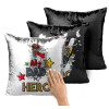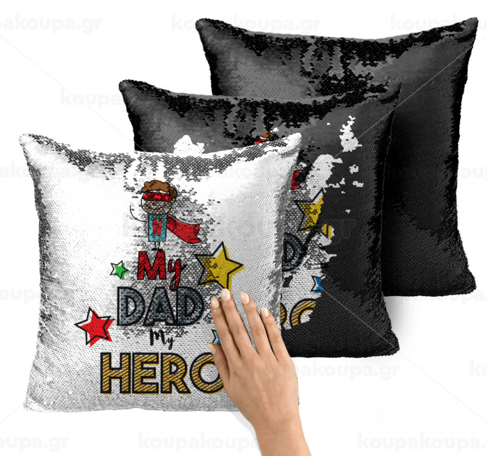 My Dad, my Hero!!!, Μαξιλάρι καναπέ Μαγικό Μαύρο με πούλιες 40x40cm περιέχεται το γέμισμα
