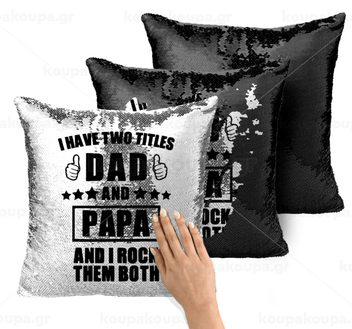 I have two title, DAD & PAPA, Μαξιλάρι καναπέ Μαγικό Μαύρο με πούλιες 40x40cm περιέχεται το γέμισμα