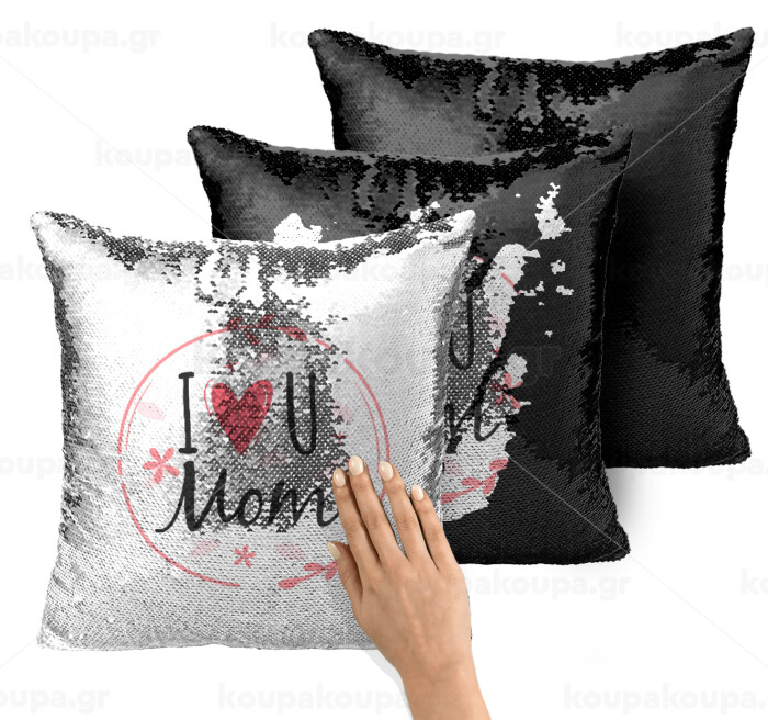 I Love you Mom pink, Μαξιλάρι καναπέ Μαγικό Μαύρο με πούλιες 40x40cm περιέχεται το γέμισμα