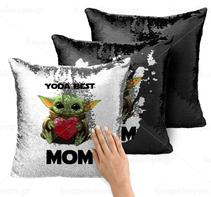 Yoda Best mom, Μαξιλάρι καναπέ Μαγικό Μαύρο με πούλιες 40x40cm περιέχεται το γέμισμα