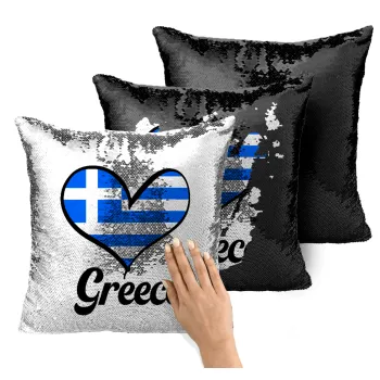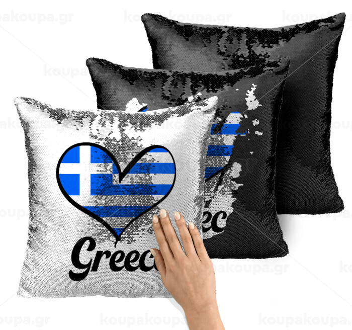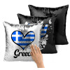 Greece flag, Μαξιλάρι καναπέ Μαγικό Μαύρο με πούλιες 40x40cm περιέχεται το γέμισμα