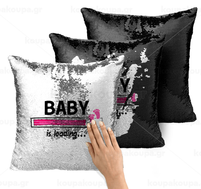 Baby is Loading GIRL, Μαξιλάρι καναπέ Μαγικό Μαύρο με πούλιες 40x40cm περιέχεται το γέμισμα