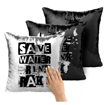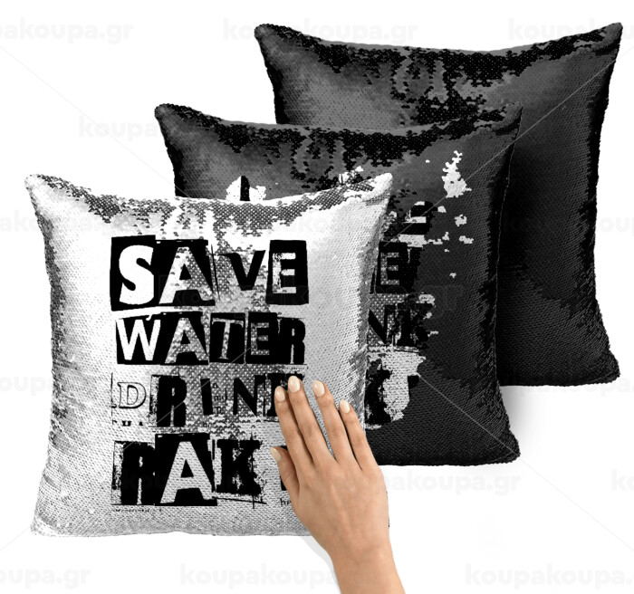 Save Water, Drink RAKI, Μαξιλάρι καναπέ Μαγικό Μαύρο με πούλιες 40x40cm περιέχεται το γέμισμα