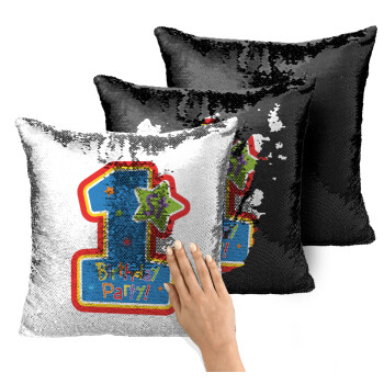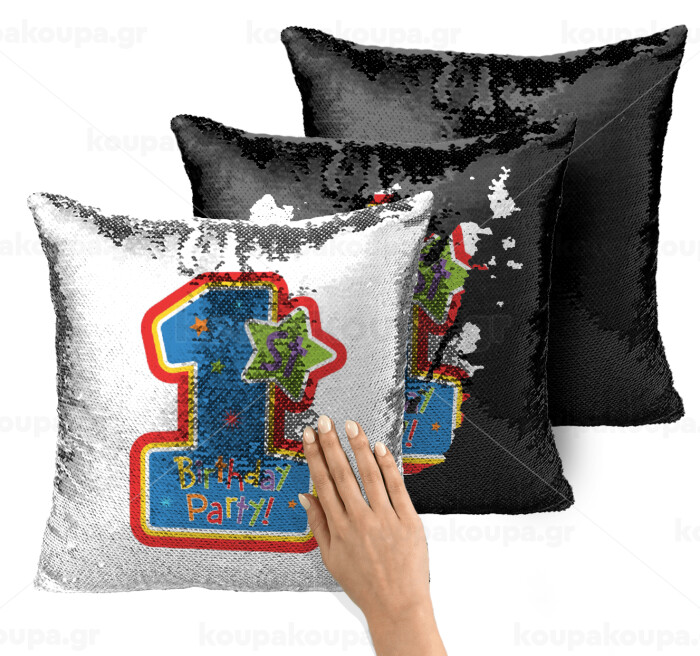 Happy 1st Birthday, Μαξιλάρι καναπέ Μαγικό Μαύρο με πούλιες 40x40cm περιέχεται το γέμισμα