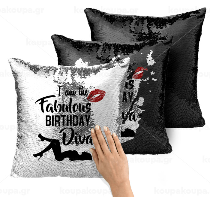 I am the fabulous Birthday Diva, Μαξιλάρι καναπέ Μαγικό Μαύρο με πούλιες 40x40cm περιέχεται το γέμισμα