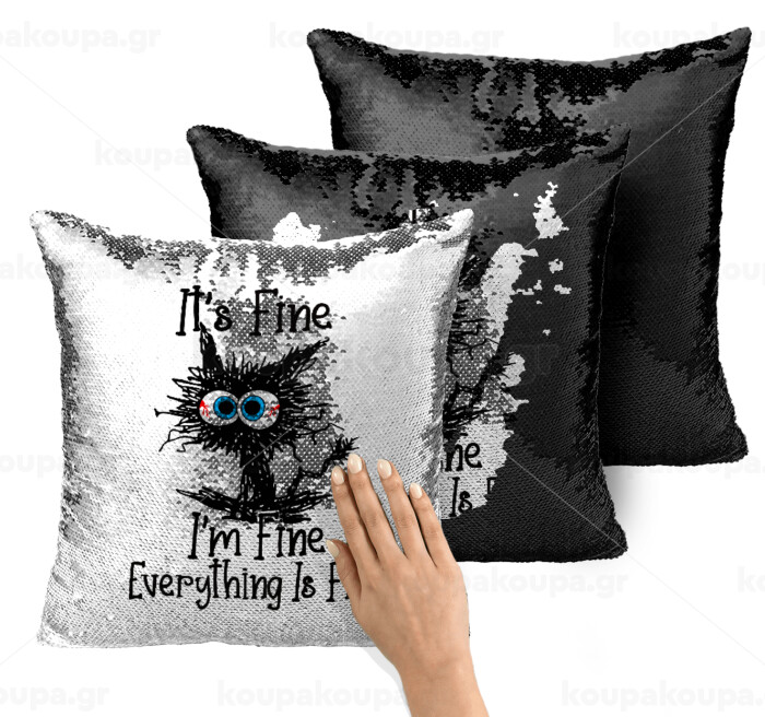 Cat, It's Fine I'm Fine Everything Is Fine, Μαξιλάρι καναπέ Μαγικό Μαύρο με πούλιες 40x40cm περιέχεται το γέμισμα