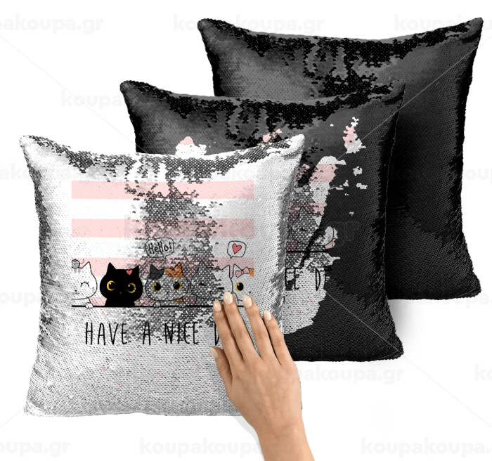 Have a nice day cats, Μαξιλάρι καναπέ Μαγικό Μαύρο με πούλιες 40x40cm περιέχεται το γέμισμα