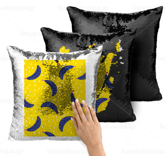 Yellow seamless with blue bananas, Μαξιλάρι καναπέ Μαγικό Μαύρο με πούλιες 40x40cm περιέχεται το γέμισμα