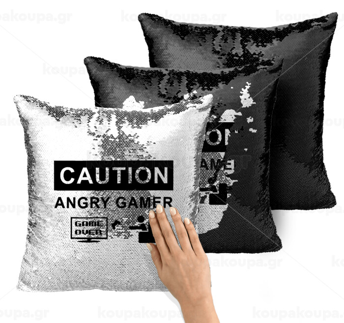Caution, angry gamer!, Μαξιλάρι καναπέ Μαγικό Μαύρο με πούλιες 40x40cm περιέχεται το γέμισμα