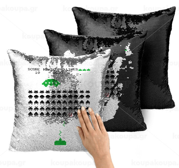 Space invaders, Μαξιλάρι καναπέ Μαγικό Μαύρο με πούλιες 40x40cm περιέχεται το γέμισμα