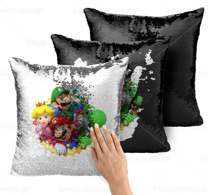 Super mario and Friends, Μαξιλάρι καναπέ Μαγικό Μαύρο με πούλιες 40x40cm περιέχεται το γέμισμα