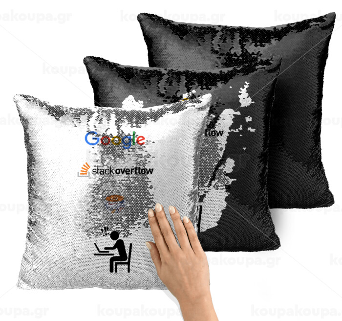 Google + Stack overflow + Coffee, Μαξιλάρι καναπέ Μαγικό Μαύρο με πούλιες 40x40cm περιέχεται το γέμισμα