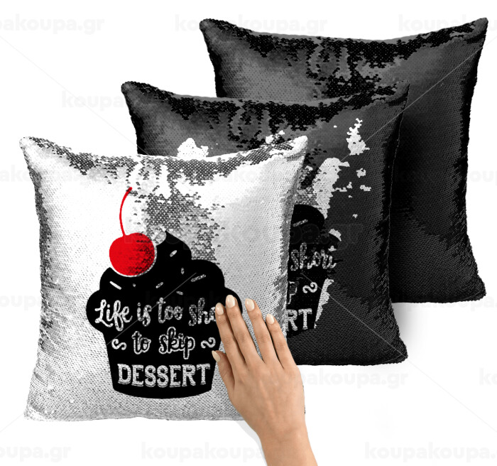 Life is too short, to skip Dessert, Μαξιλάρι καναπέ Μαγικό Μαύρο με πούλιες 40x40cm περιέχεται το γέμισμα