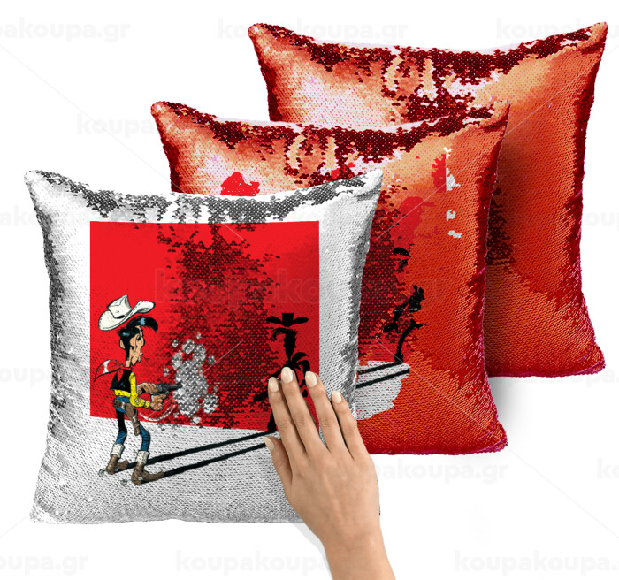Λούκυ Λουκ σκιές, Μαξιλάρι καναπέ Μαγικό Κόκκινο με πούλιες 40x40cm περιέχεται το γέμισμα