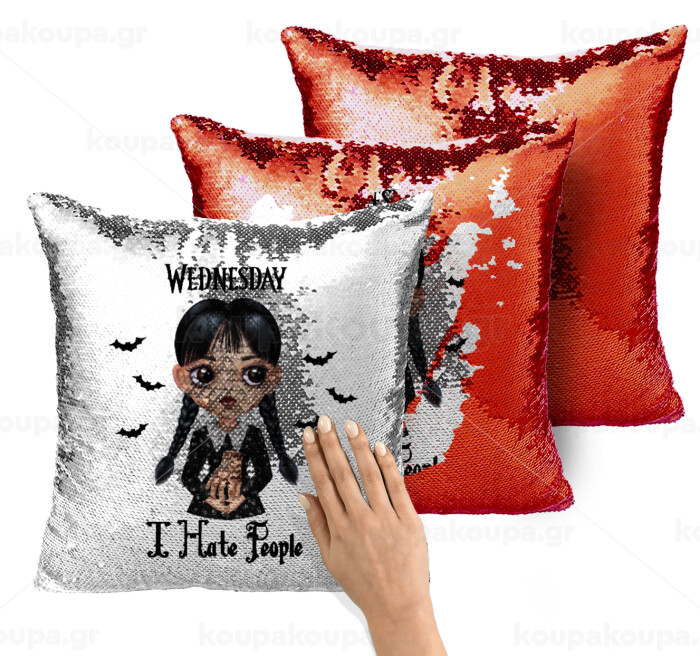 Wednesday Adams, i hate people, Μαξιλάρι καναπέ Μαγικό Κόκκινο με πούλιες 40x40cm περιέχεται το γέμισμα