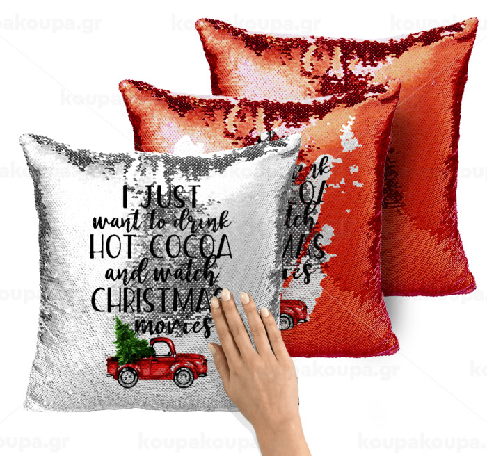 I just want to drink hot cocoa and watch christmas movies pickup car, Μαξιλάρι καναπέ Μαγικό Κόκκινο με πούλιες 40x40cm περιέχεται το γέμισμα