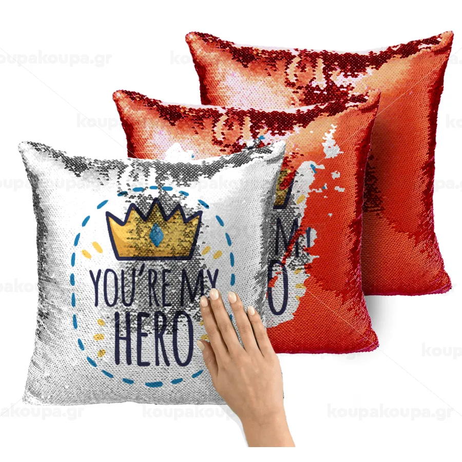 Dad, you are my hero!, Μαξιλάρι καναπέ Μαγικό Κόκκινο με πούλιες 40x40cm περιέχεται το γέμισμα