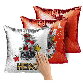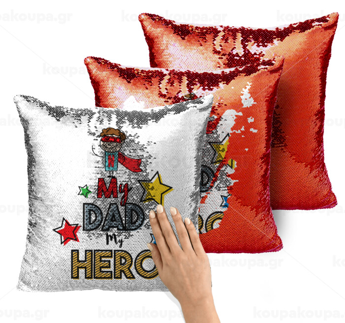 My Dad, my Hero!!!, Μαξιλάρι καναπέ Μαγικό Κόκκινο με πούλιες 40x40cm περιέχεται το γέμισμα