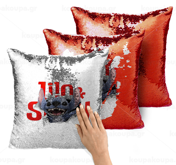 Stitch movie, Μαξιλάρι καναπέ Μαγικό Κόκκινο με πούλιες 40x40cm περιέχεται το γέμισμα