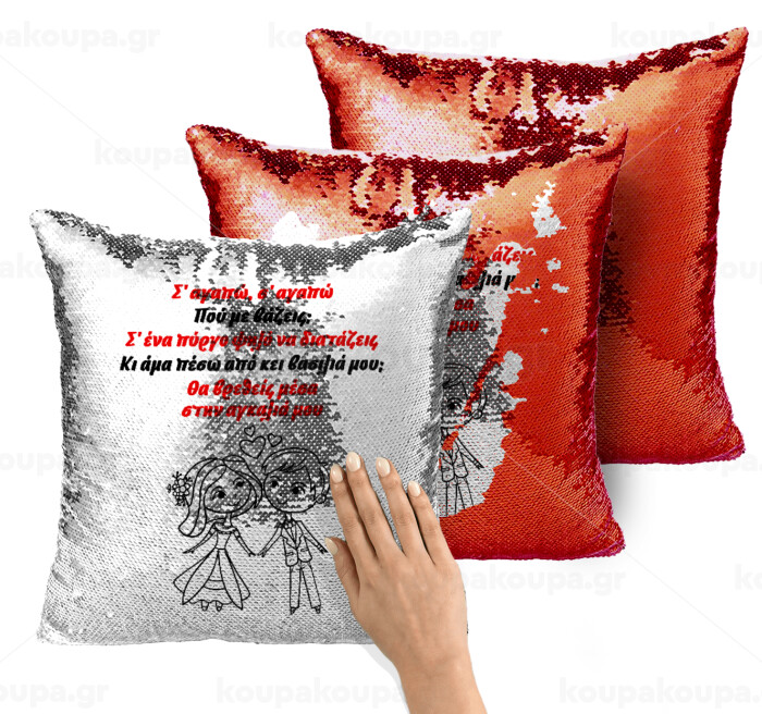 Σ΄ αγαπώ σ΄ αγαπώ που με βάζεις, Μαξιλάρι καναπέ Μαγικό Κόκκινο με πούλιες 40x40cm περιέχεται το γέμισμα