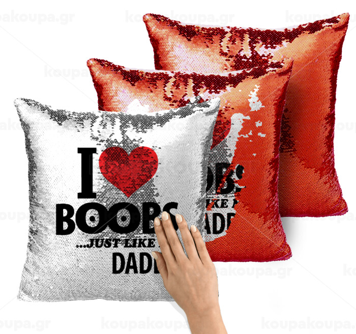 I Love boobs ...just like my daddy, Μαξιλάρι καναπέ Μαγικό Κόκκινο με πούλιες 40x40cm περιέχεται το γέμισμα