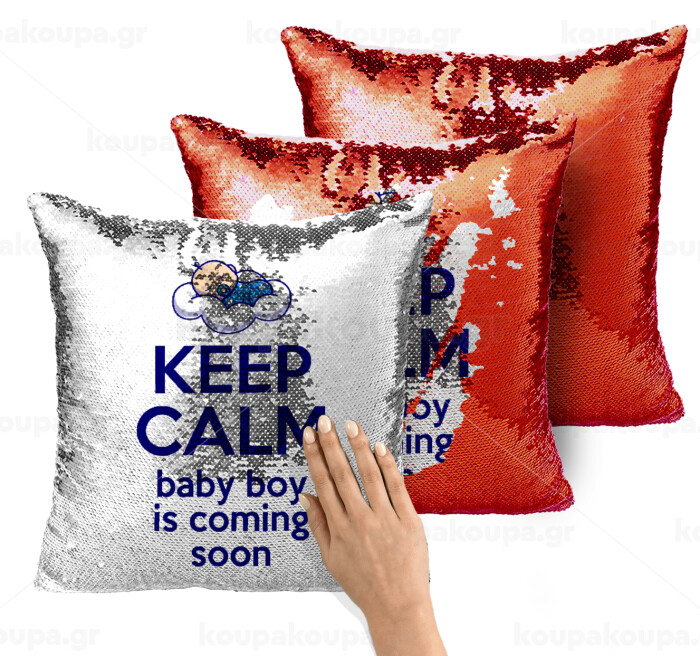 KEEP CALM baby boy is coming soon!!!, Μαξιλάρι καναπέ Μαγικό Κόκκινο με πούλιες 40x40cm περιέχεται το γέμισμα