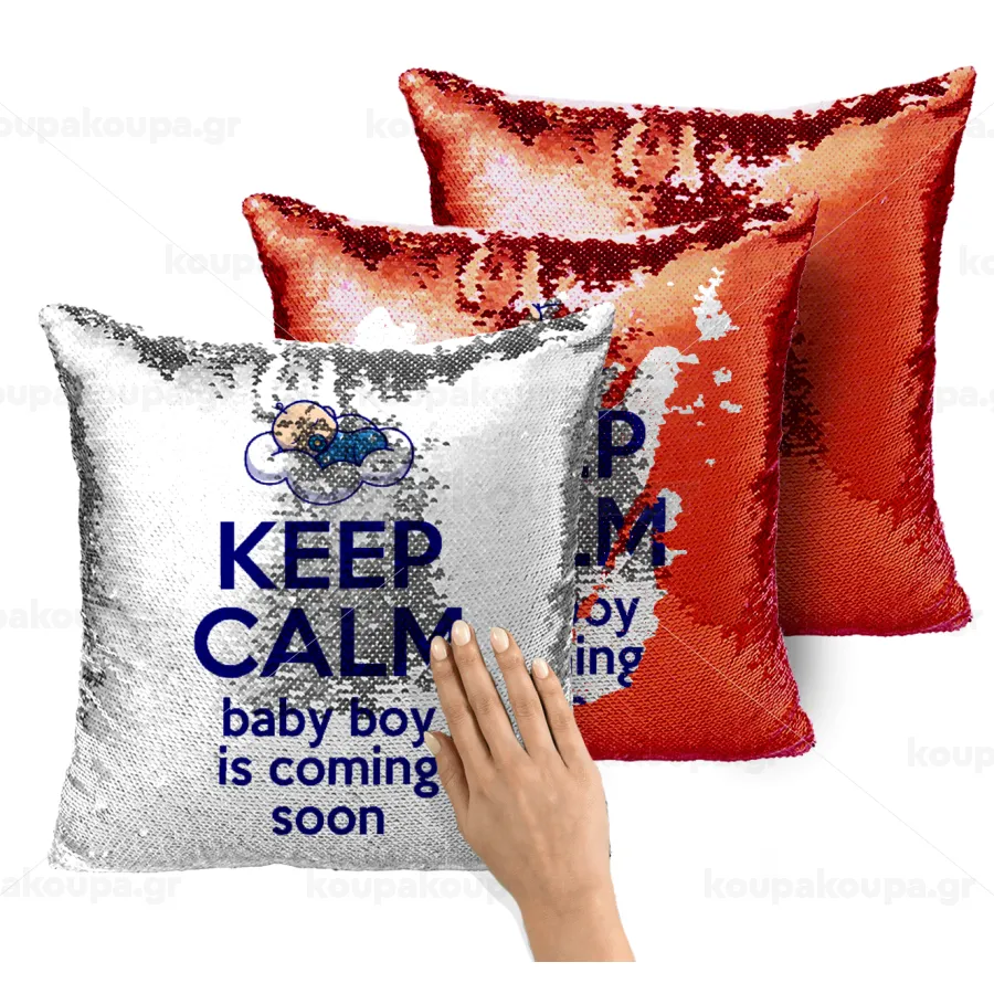 KEEP CALM baby boy is coming soon!!!, Μαξιλάρι καναπέ Μαγικό Κόκκινο με πούλιες 40x40cm περιέχεται το γέμισμα