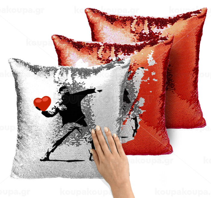 Banksy (The heart thrower), Μαξιλάρι καναπέ Μαγικό Κόκκινο με πούλιες 40x40cm περιέχεται το γέμισμα
