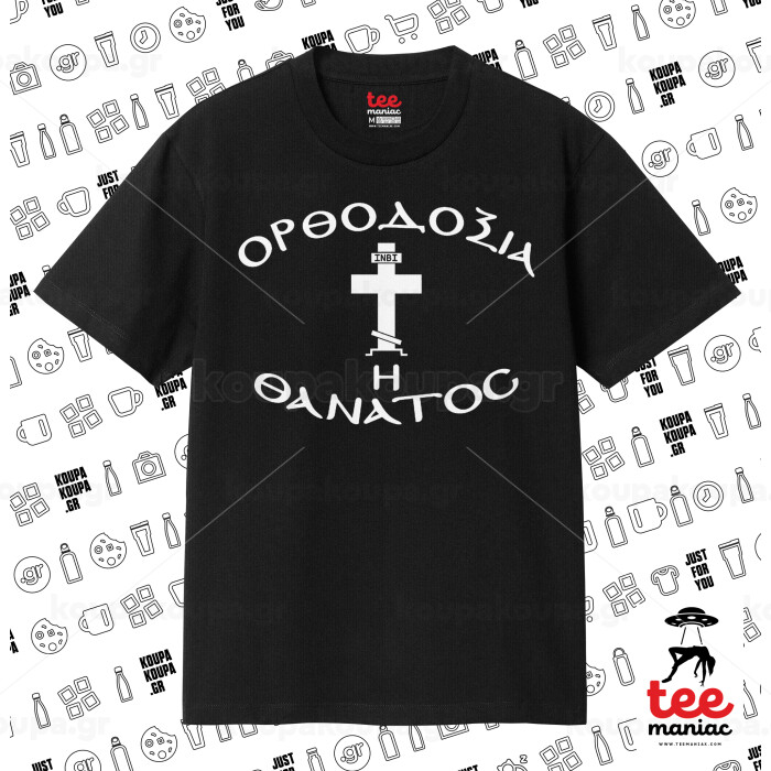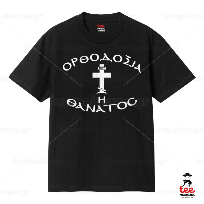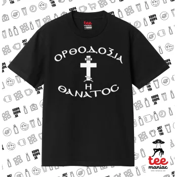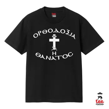 Ορθοδοξία ή Θάνατος, Κλασικό T-Shirt, διπλής ραφής, χωρίς πλευρικές ραφές ΜΑΥΡΟ από 100% βαμβάκι. Vegan & OEKO-TEX πιστοποιημένο.