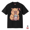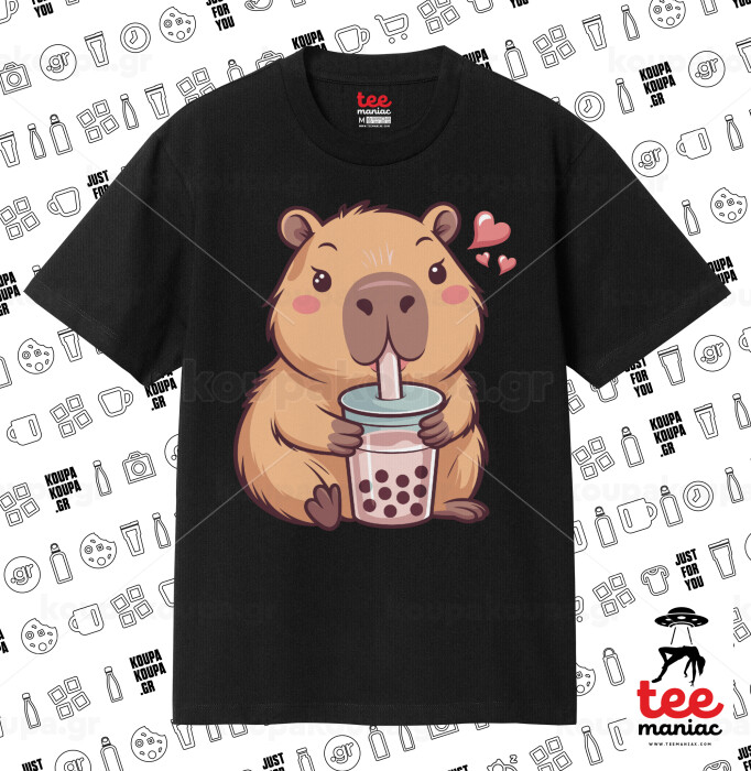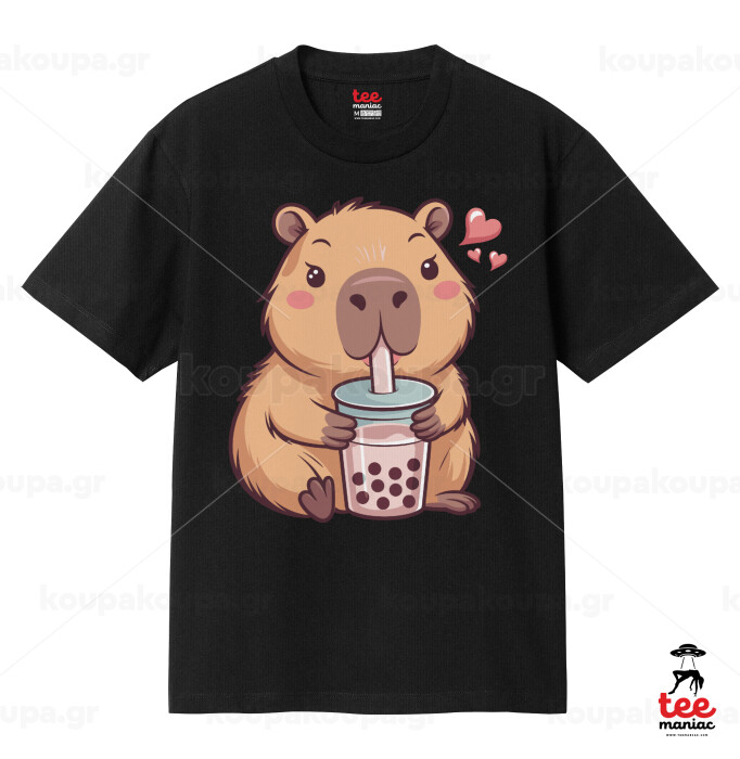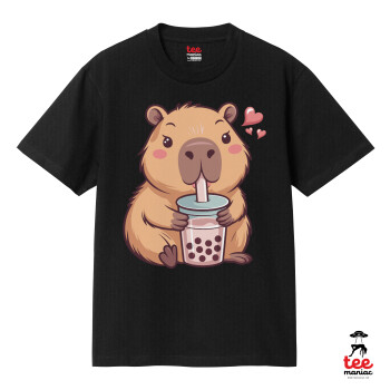 Capybara Bubble Tea, Κλασικό T-Shirt, διπλής ραφής, χωρίς πλευρικές ραφές ΜΑΥΡΟ από 100% βαμβάκι. Vegan & OEKO-TEX πιστοποιημένο.