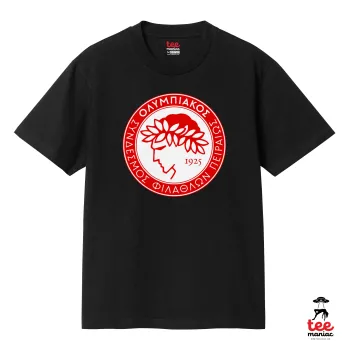 Ολυμπιακός, Κλασικό T-Shirt, διπλής ραφής, χωρίς πλευρικές ραφές ΜΑΥΡΟ από 100% βαμβάκι. Vegan & OEKO-TEX πιστοποιημένο.