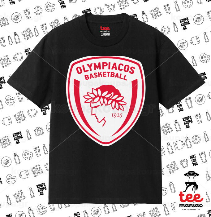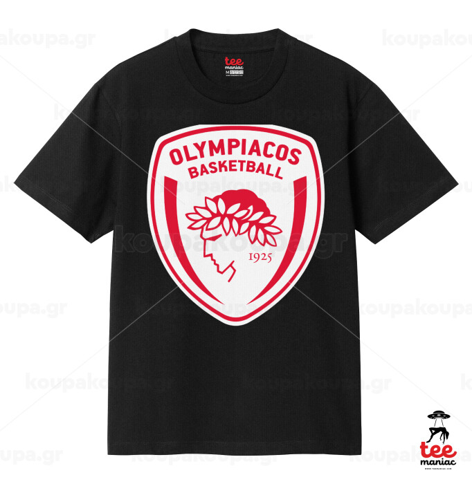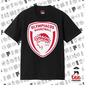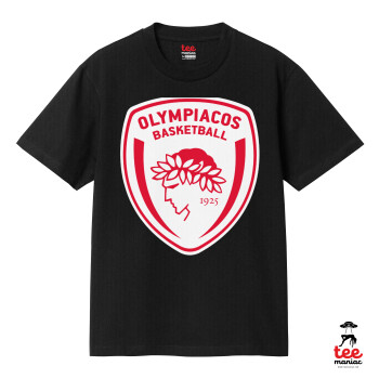 Olympiacos B.C., Κλασικό T-Shirt, διπλής ραφής, χωρίς πλευρικές ραφές ΜΑΥΡΟ από 100% βαμβάκι. Vegan & OEKO-TEX πιστοποιημένο.