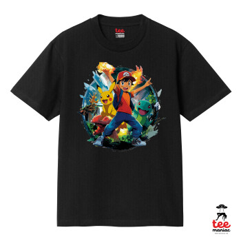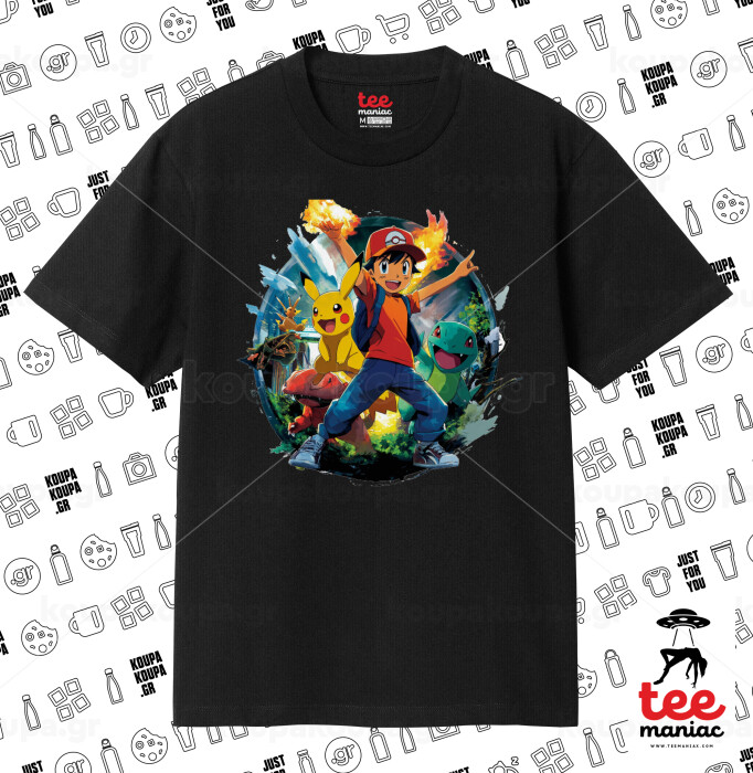 Ash Ketchum & Pikachu, Κλασικό T-Shirt, διπλής ραφής, χωρίς πλευρικές ραφές ΜΑΥΡΟ από 100% βαμβάκι. Vegan & OEKO-TEX πιστοποιημένο.