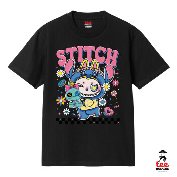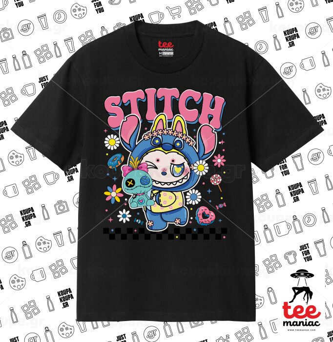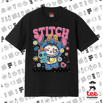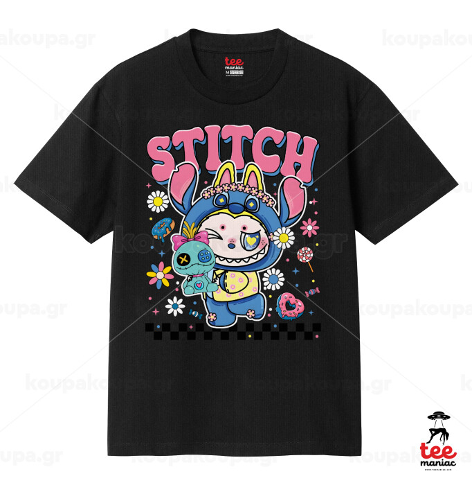 Labubu Stitch, Κλασικό T-Shirt, διπλής ραφής, χωρίς πλευρικές ραφές ΜΑΥΡΟ από 100% βαμβάκι. Vegan & OEKO-TEX πιστοποιημένο.
