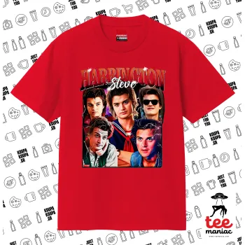 Steve Harrington, Stranger Things, Κλασικό T-Shirt, διπλής ραφής, χωρίς πλευρικές ραφές ΚΟΚΚΙΝΟ από 100% βαμβάκι. Vegan & OEKO-TEX πιστοποιημένο.