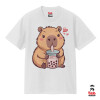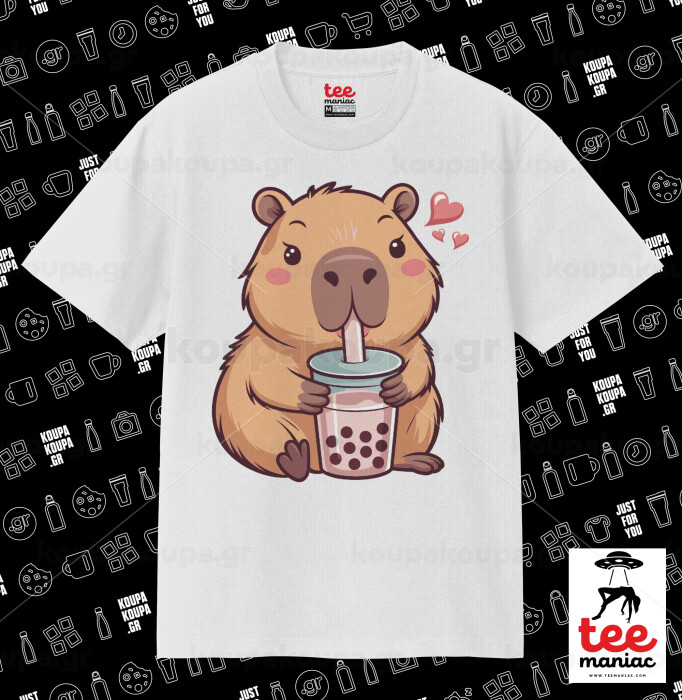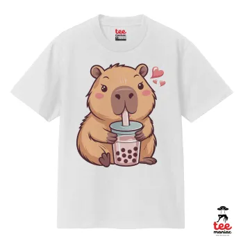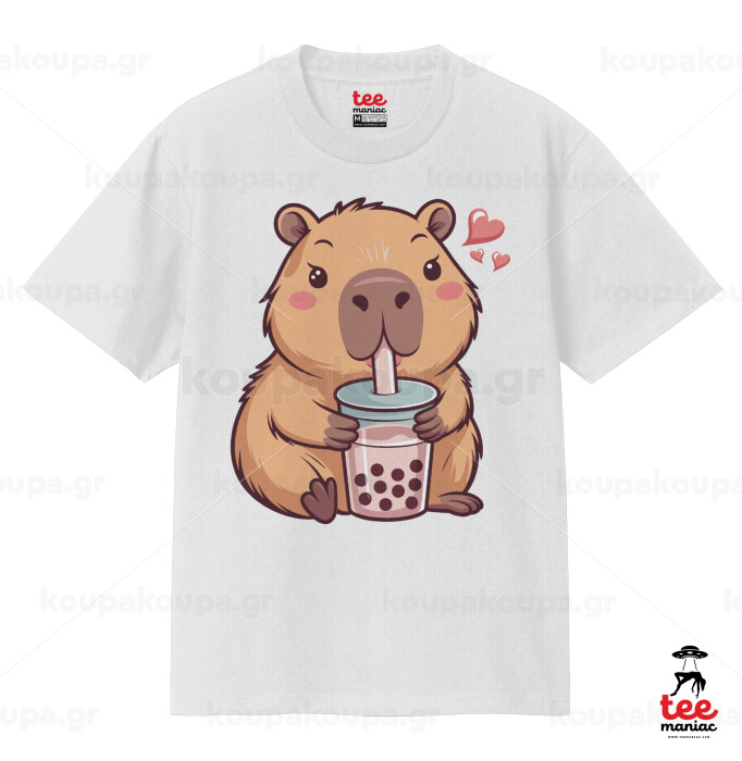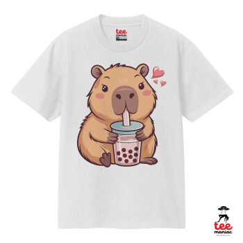 Capybara Bubble Tea, Κλασικό T-Shirt, διπλής ραφής, χωρίς πλευρικές ραφές ΛΕΥΚΟ από 100% βαμβάκι. Vegan & OEKO-TEX πιστοποιημένο.