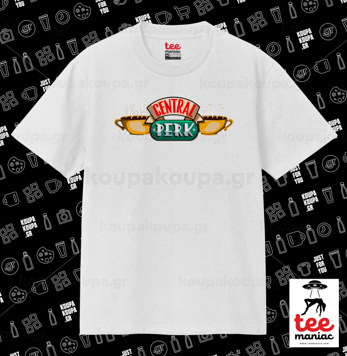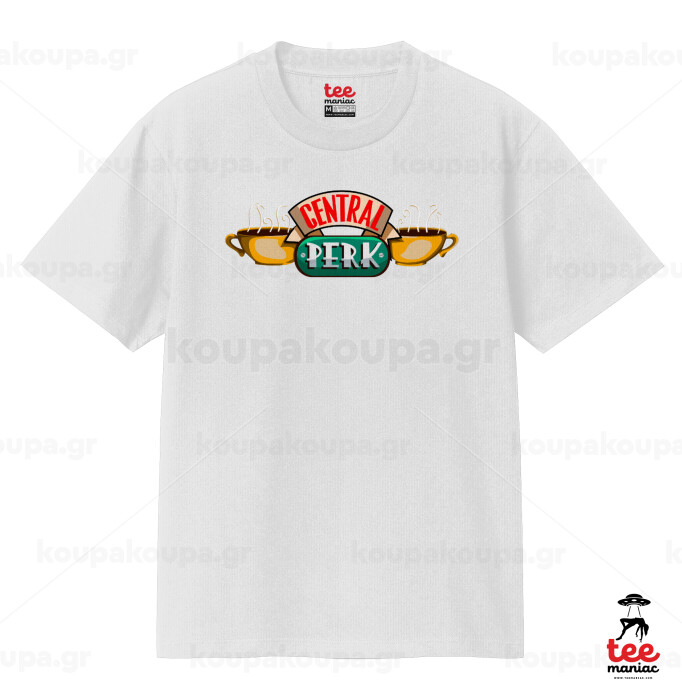 Central perk, Κλασικό T-Shirt, διπλής ραφής, χωρίς πλευρικές ραφές ΛΕΥΚΟ από 100% βαμβάκι. Vegan & OEKO-TEX πιστοποιημένο.